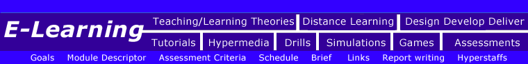 Class Homepage | Teaching/Learning Theories | Distance Learning | Design Develop Deliver | Tutorials |Hypermedia | Drills | Simulations | Games | Assessments Goals | Module Descriptor |Assessment Criteria | Schedule | Brief | Links | Report Writing | Hyperstaffs